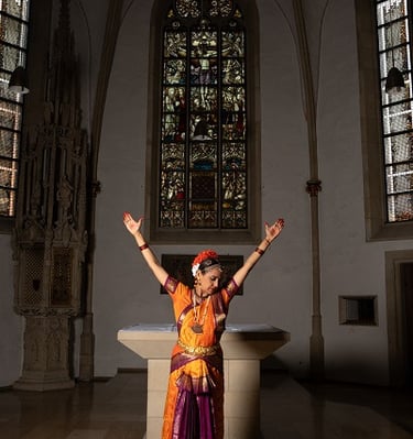 Ihr Herzensthema ist er interkulturelle und interreligiöse Dialog. Daher tanzt und lehrt sie sowohl zu Themen der indischen als auch der abrahamitischen Religiosität und Spiritualität.